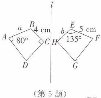 5. 如图,两个四边形关于直线l对称,$\angle C= 90^{\circ}$,求出a,b的长度和$\angle G$的度数。
