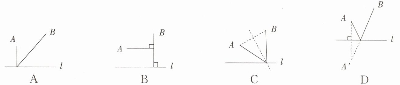 3. 已知直线l代表一条公路,A,B两点代表两个村庄,欲在公路上的某点处修建一个车站。现有如下四种修建方案,若图中实线表示修建的道路,则修建道路最短的方案是()