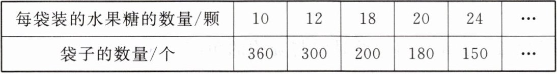 (1) 因为每袋装的水果糖数量与袋子数量的乘积就是水果糖的总数,观察表格可得$10\times360 = 3600$(颗),$12\times300 = 3600$(颗),$18\times200 = 3600$(颗)等,所以这批水果糖总数是一定的,为$3600$颗。