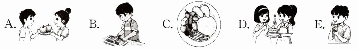 1. 句子“Cut your bread. Cut, cut, cut!”意思是切你的面包,切,切,切!图片B是一个男孩在切面包,与之匹配。