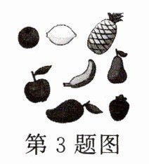 3. 图中是各种水果,“水果”的英文是“fruit”,表示水果的总称时是不可数名词。