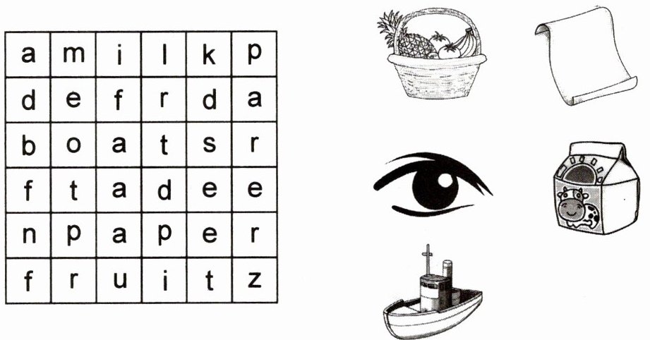 圈出“fruit”“paper”“eye”“milk”“boat” 。