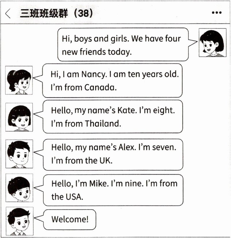 六、三班来了几名新同学,他们正在班级群里进行自我介绍。阅读聊天记录,完成下列任务。