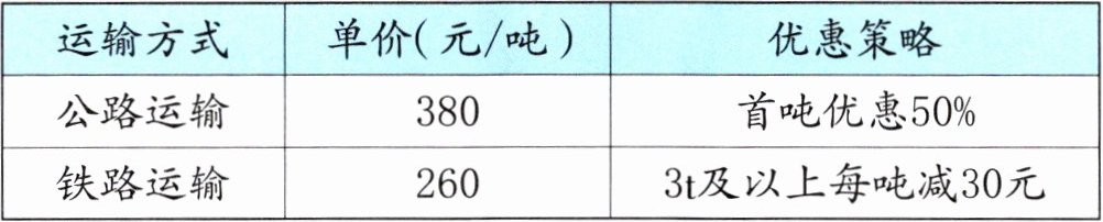 7. 怀姜为国家地理标志产品。位于焦作市博爱县的怀姜合作社需将$3t$怀姜运往郑州加工厂,运输方案如下表。铁路运输比公路运输便宜多少元?