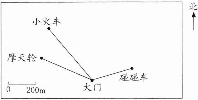 (2)量一量,算一算:图中你最喜欢玩的是(),从大门到该游乐设施的图上距离是(),请求出它的实际距离。如果以每分钟80m的速度从大门走到那里,需要用几分钟?(结果取整数)