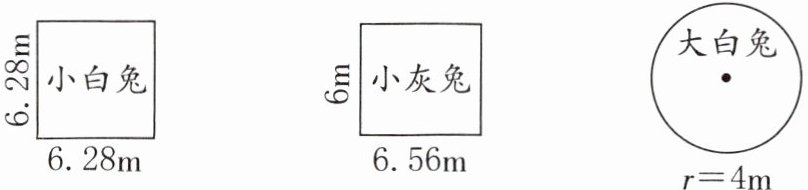 (2)小白兔:$6.28×6.28=39.4384(m^{2})$ 小灰兔:$6.56×6=39.36(m^{2})$ 大白兔:$3.14×4^{2}=50.24(m^{2})$ $50.24>39.4384>39.36$ 大白兔围的菜园面积最大,小灰兔围的菜园面积最小。
