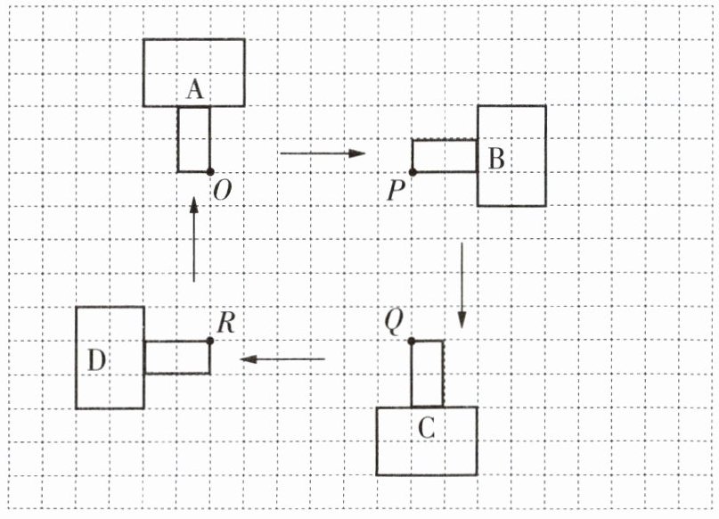 图形A先绕点O顺时针旋转90°,再向右平移6格得到图形B;图形B先绕点P顺时针旋转90°,再向下平移5格得到图形C;图形C先绕点Q顺时针旋转90°,再向左平移6格得到图形D;图形D先绕点R顺时针旋转90°,再向上平移5格得到图形A。(也可以先平移再旋转)
