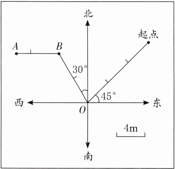 (1)扫地机器人从起点沿南偏西(或西偏南)$45^{\circ }$方向移动 12m 到达 O 点,再沿北偏西$30^{\circ }$方向移动 8m 到达 B 点,最后沿正西方向移动 6m 到达A 点。