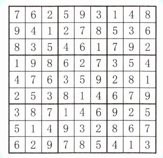 数独是一种逻辑性很强的数字填充游戏,游戏参与者要把数字填进每一格,使每一行、每一列和每个宫(即3×3的大格)都有1~9这9个数字。