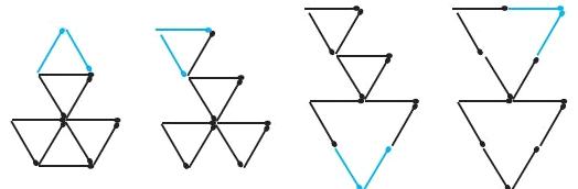 1.用同样长的火柴棒拼成6个等边三角形(如下图)。你能移动其中的两根,使这个图形变成5个等边三角形吗?再移动两根,使它变成4个等边三角形。照此方法继续移动,直至等边三角形变为2个。(等边三角形的大小不限,但重叠处不算在内)