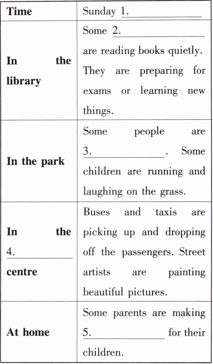 1. afternoon 2. students 3. jogging 4. city 5. cookies