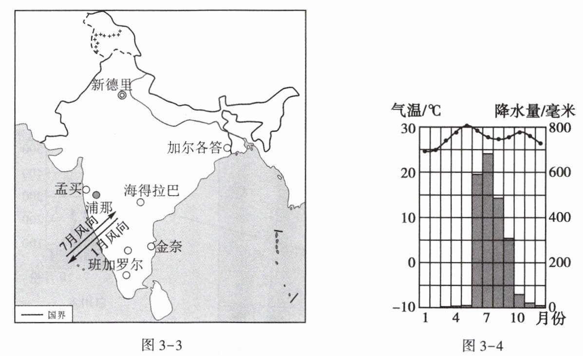 谷歌宣布在印度建立AI实验室,致力服务当地农业、医疗、教育,并承诺将在印度扩大AI洪水警报系统,通过智慧手机或志愿者向附近居民发出洪水警告。图3-3为印度1月、7月盛行风向示意图,图3-4为孟买气候资料统计图。据此完成4~6题。