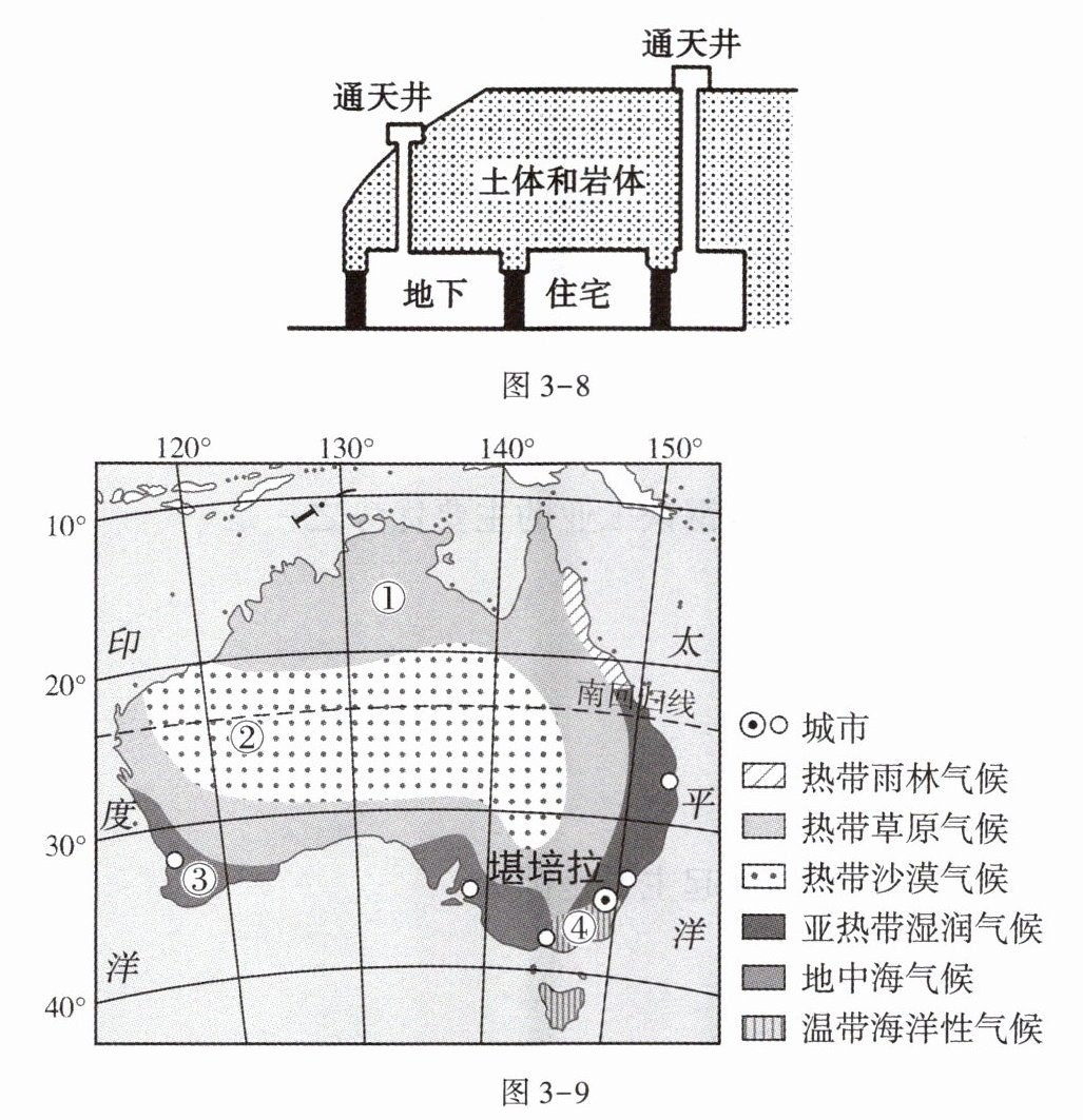 澳大利亚某地区降水稀少,自然景观极度荒凉,气温年较差大,夏季最高气温可达50℃,冬季气温较低。早年,该地区的矿工经常在矿井里躲避炎热天气,长此以往便形成了当地特色的地下住宅(图3-8)。图3-9为澳大利亚气候类型分布示意图。据此完成14~15题。