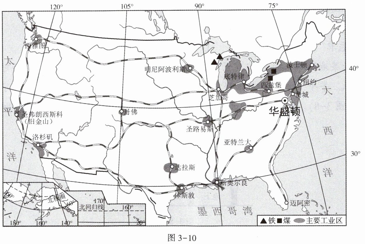 美国工业发达,东北部工业区集中了全国大部分的钢铁、机械、汽车、化工等工业,而航空航天、电子、信息技术等产业云集于西部和南部工业区。图3-10为美国主要工业区分布示意图。据此完成16~18题。