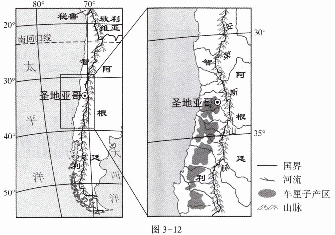 (3)圣地亚哥属地中海气候,夏季高温少雨,光照强,符合车厘子喜光、喜温的习性;地形以山地为主,利于排水。