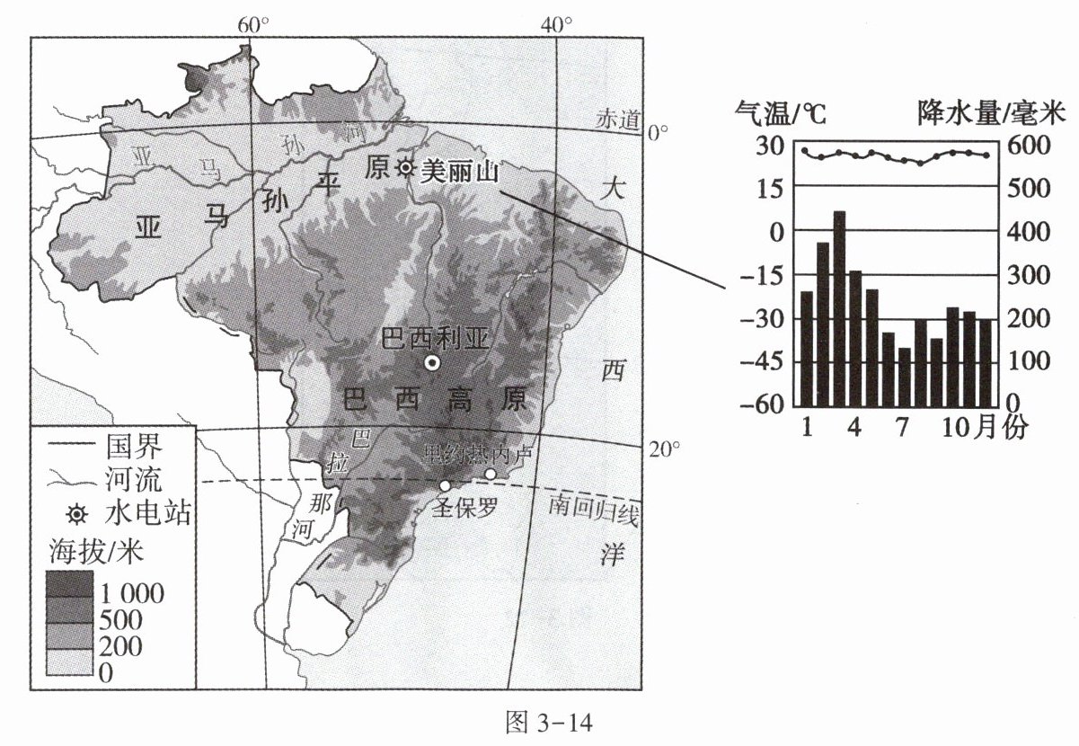 在巴西广袤的土地上,高耸的铁塔连接起一条条输电线,将亚马孙雨林中产出的清洁电能送至东南部地区。这就是巴西美丽山项目,巴西第二大水电站——美丽山水电站的特高压直流送出工程,也是我国首个特高压技术“走出去”项目。图3-14为美丽山水电站位置示意图及所在地气候资料统计图。