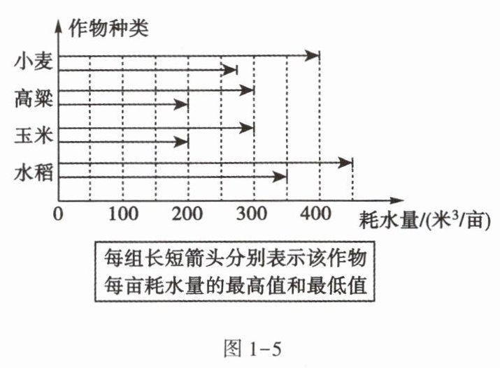 7. 农业工作者调查了几种农作物整个生长周期里的耗水情况,并绘成图1-5,综合分析图中内容可知,每亩耗水量最多的作物是()