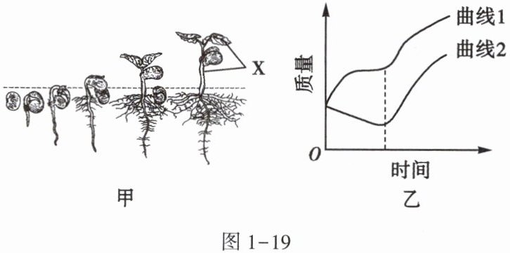 (4)图1-19乙表示在自然状态下,完整的种子萌发过程中质量的变化,其中可表示有机物质量变化的曲线是____(填“曲线1”或“曲线2”)。