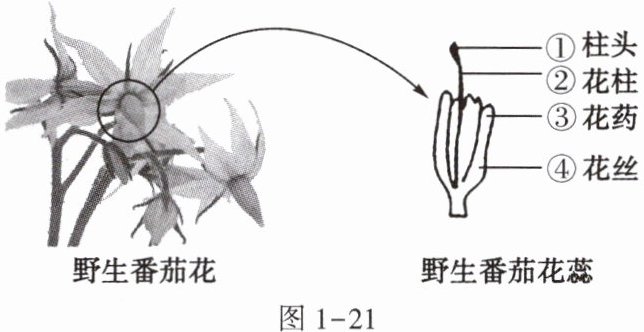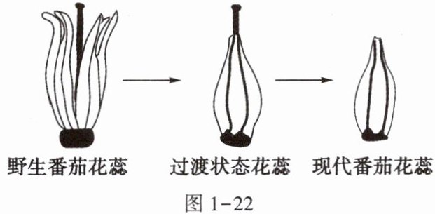 (2)在人们将野生番茄培育成现代番茄的过程中,番茄花的结构发生了改变。根据图1-22可知,与野生番茄花蕊相比,现代番茄花蕊的结构变化为____,从而实现自花传粉和闭花授粉。