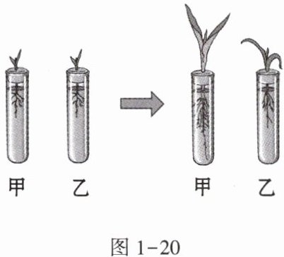 12. 将两株同样大小的玉米幼苗,分别培养在盛有蒸馏水和土壤浸出液的试管中,两周后,观察这两株幼苗的长势如图1-20所示,请分析回答下列问题。