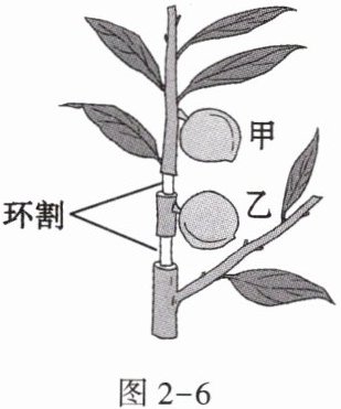 6. 如图2-6所示,一根枝条上面长有两个大小相同的果实。如果将枝条的两个部位的树皮进行环割,那么经过一段时间后,甲、乙两果实的变化是()