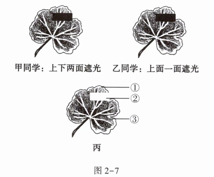 (3) 若采用正确的方法对银边天竺葵的叶片遮光处理后,移至光下照射3~4小时,摘下叶片,去掉黑纸片,用____脱色处理,滴加碘液,结果如图2-7丙所示。①②两处不变蓝,③处变蓝。与③处相比,①处不变蓝的原因是____。