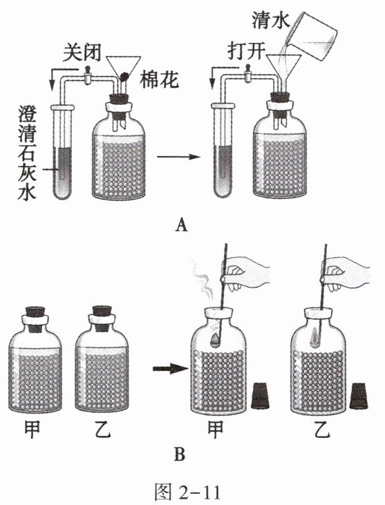 (1) 如图2-11A,瓶中装的是萌发的种子。实验开始时阀门是关闭的。过一段时间以后,往瓶子里注入清水,打开阀门,使瓶内的气体进入试管。观察到澄清的石灰水变浑浊,这说明种子在萌发过程中进行呼吸作用释放出____(填“氧气”或“二氧化碳”)。