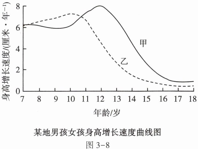 (1) 曲线甲表示______(填“男”或“女”)孩身高增长速度的变化。