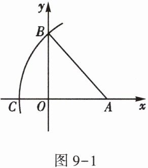 3. 如图 9-1,$ A(2\sqrt{2},0) $,$ AB = 3\sqrt{2} $,以点 $ A $ 为圆心,$ AB $ 长为半径画弧交 $ x $ 轴负半轴于点 $ C $,则点 $ C $ 的坐标为()