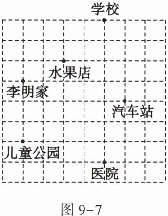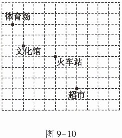 5. 请给图 9-10 建立平面直角坐标系,使文化馆的坐标为 $ (-3,1) $,超市的坐标为 $ (2,-3) $。