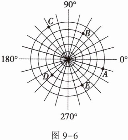 1. 如图 9-6,雷达探测器在一次探测中发现五个目标。若目标 $ A $,$ B $ 的位置分别记为 $ (5,345^{\circ}) $,$ (4,60^{\circ}) $,则目标 $ D $ 的位置记为()
