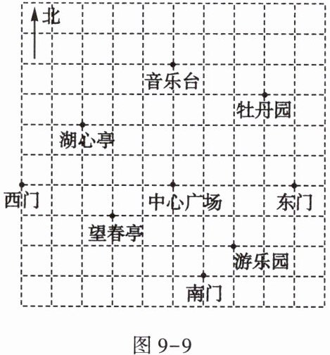 4. 某学校组织七年级学生去景区参加实践活动。学生张明和李华对着景区示意图 9-9(图中每个小正方形的边长均为 $ 100m $)描述景点牡丹园的位置,张明说:“牡丹园的坐标是 $ (300,300) $。”李华说:“牡丹园在中心广场东北方向约 $ 420m $ 处。”如果两人的说法都是正确的,那么根据以上信息,下列说法错误的是()
