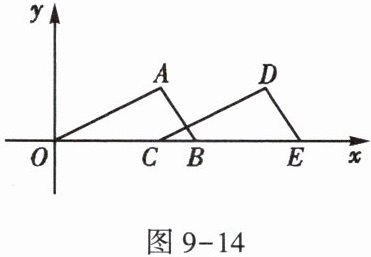5. 如图 9-14,在平面直角坐标系中,三角形 $ OAB $ 的顶点 $ A $,$ B $ 的坐标分别为 $ (3,\sqrt{3}) $,$ (4,0) $。把三角形 $ OAB $ 沿 $ x $ 轴向右平移得到三角形 $ CDE $,如果点 $ D $ 的坐标为 $ (6,\sqrt{3}) $,那么点 $ E $ 的坐标为______。