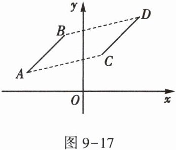 1. 如图 9-17,已知 $ A $,$ B $ 两点的坐标分别为 $ A(-3,1) $,$ B(-1,3) $,将线段 $ AB $ 平移得到线段 $ CD $。若点 $ A $ 的对应点是 $ C(1,2) $,则点 $ B $ 的对应点 $ D $ 的坐标是()