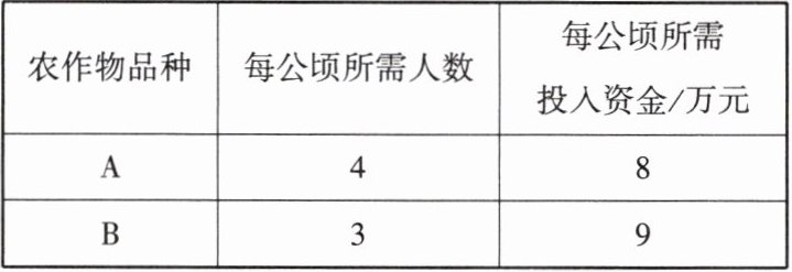 2. 乡村振兴战略实施以来,很多外出人员返乡创业. 某村有部分返乡青年承包了一些田地,采用新技术种植A,B两种农作物. 种植这两种农作物每公顷所需人数和投入资金如下表: