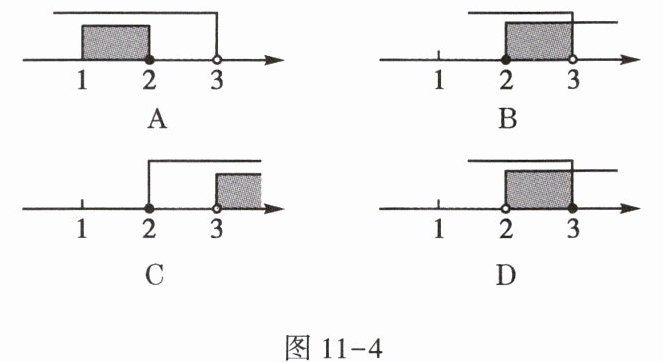 1. 不等式组$\begin{cases}3x - 2 < 2x + 1, \\ x \geq 2\end{cases}$的解集在数轴上的表示应为图11-4中的()