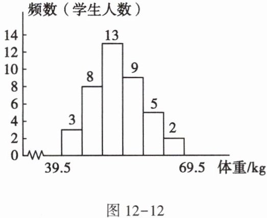 8. 某班40名学生体重的频数分布直方图(不完整)如图12-12所示,组距为______kg。