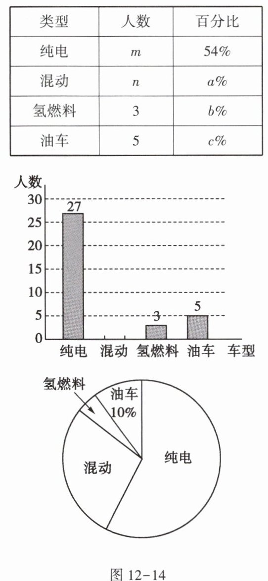 12. 中国新能源产业异军突起。中国车企在政策引导和支持下,瞄准纯电、混动和氢燃料等多元技术路线,加大研发投入形成了领先的技术优势。2023年,中国新能源汽车产销量均突破900万辆,连续9年位居全球第一。在某次汽车展览会上,工作人员随机抽取了部分参展人员进行了“我最喜欢的汽车类型”的调查活动(每人限选其中一种类型),如图12-14所示,并将数据整理后,绘制成下面有待完成的统计表、条形图和扇形图。