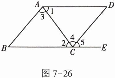9. 如图7-26,有以下四个条件:①$∠B+∠BCD= 180^{\circ }$;②$∠1= ∠2$;③$∠3= ∠4$;④$∠B= ∠5$。其中能判定$AB// CD$的条件的个数为()