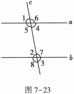 3. 如图7-23,直线a,b与直线c相交,有下列条件:①$∠1= ∠2$;②$∠5= ∠6$;③$∠4= ∠2$;④$∠5+∠3= 180^{\circ }$。其中能判断$a// b$的是____(填序号)。