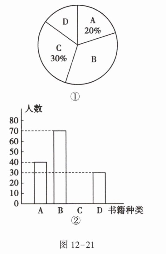 13. 在“世界读书日”前,某校开展了“共享阅读,向上人生”的读书活动。活动中,为了解学生对书籍种类(A. 艺术类;B. 科技类;C. 文学类;D. 体育类)的喜欢情况,在全校范围内随机抽取若干名学生进行问卷调查(每个被调查的学生必须选择而且只能在这四种类型中选择一项),将数据进行整理并绘制成如图12-21所示的不完整的统计图。