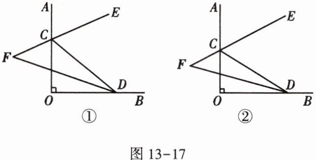 (2)当C,D在射线OA,OB上任意移动时(不与点O重合,如图13-17②),$∠F$的度数是否变化?若变化,请说明理由;若不变化,求出$∠F$的度数.