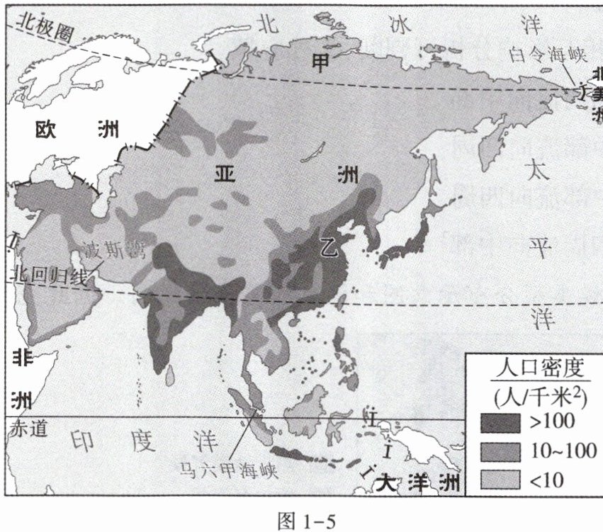 亚洲是世界上面积最广袤、人口最多的大洲,其人口分布不均,经济发展地区不均衡。图1-5为亚洲人口密度示意图。据此完成11~13题。