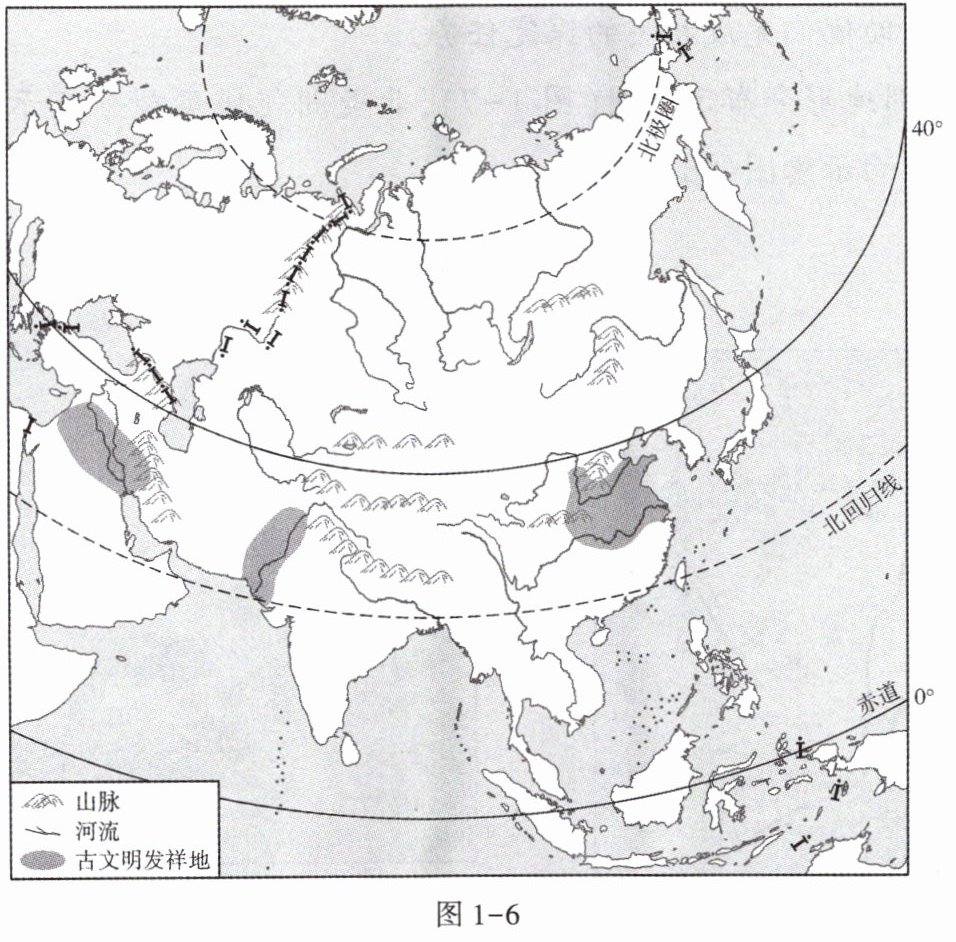 亚洲古文明多姿多彩,是人类文明的摇篮。图1-6为亚洲古文明发祥地位置示意图。据此完成16~18题。