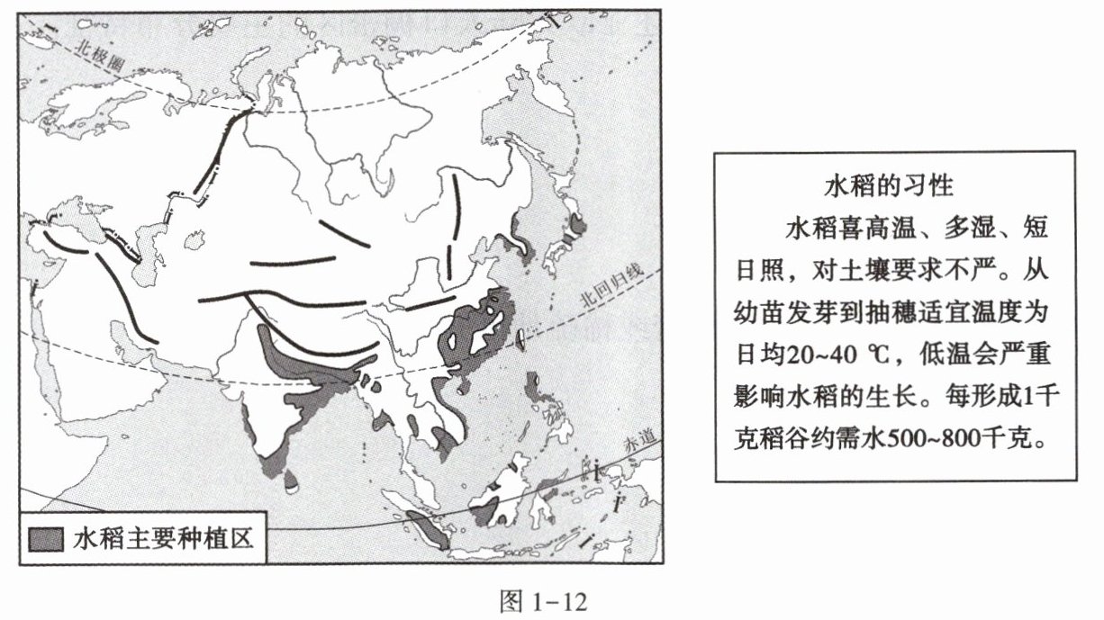 亚洲是世界最大的水稻生产区和消费区,水稻被称为“亚洲的粮食”。图1-12为亚洲水稻主要种植区示意图和水稻习性介绍。