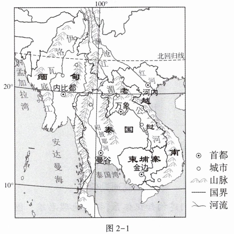 中南半岛因在中国以南而得名,与我国山水相连。图2-1为东南亚中南半岛地形示意图。据此完成1~2题。