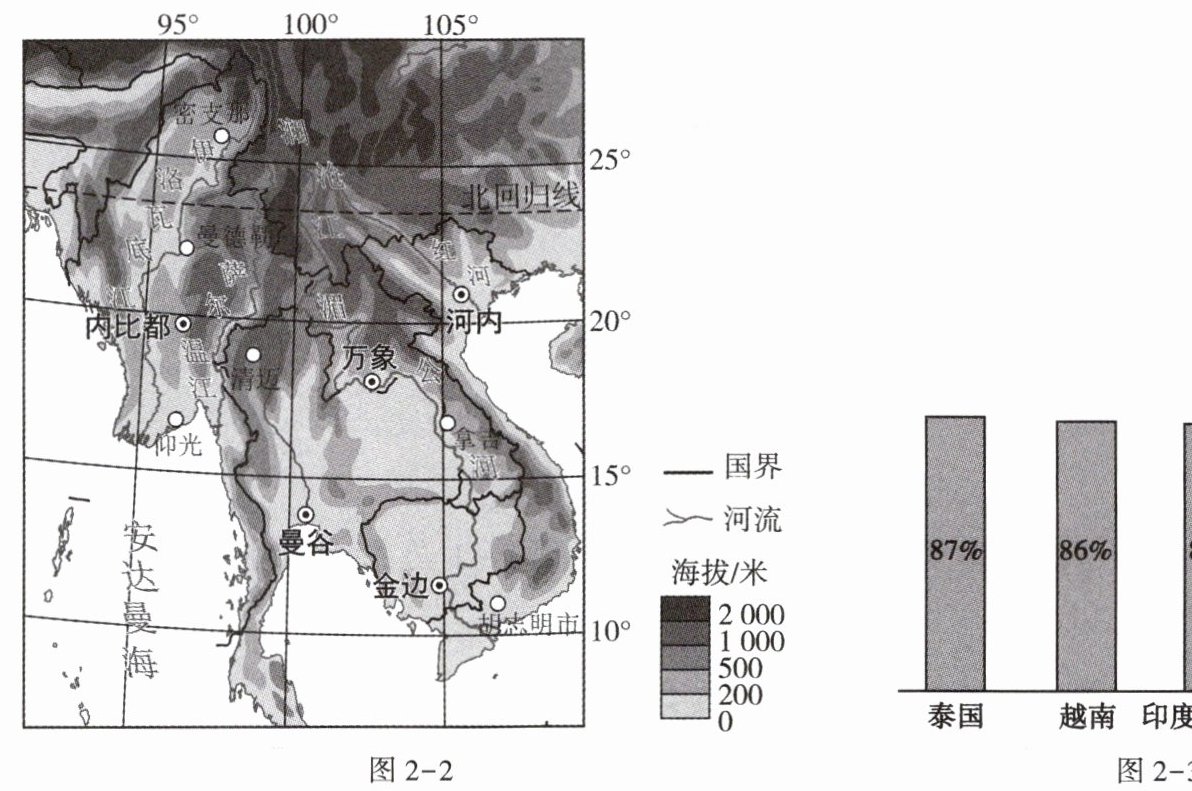 摩托车车体小巧、爬坡能力强,是东南亚国家交通工具的重要组成部分。近年来,东南亚许多国家纷纷推进摩托车“油改电”,以提升新能源消费占比。图2-2为东南亚中南半岛地形示意图,图2-3为2023年东南亚部分国家摩托车家庭拥有率示意图。据此完成3~4题。