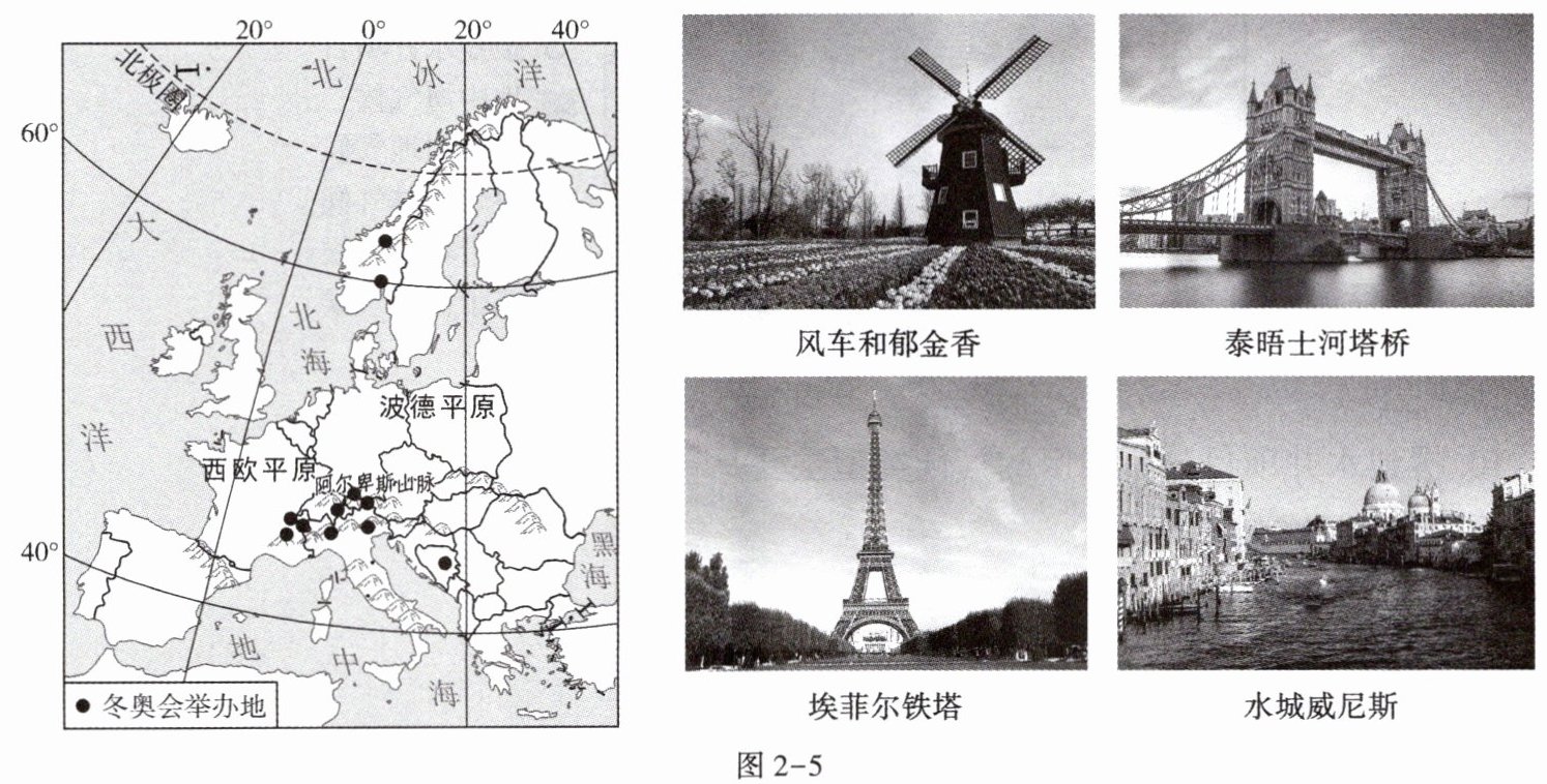 第25届冬季奥林匹克运动会将由意大利米兰和科尔蒂纳丹佩佐两个城市主办。在已经举办的24届冬季奥林匹克运动会中,欧洲西部共承办了13届,承办地平均雪期长达6个月。图2-5为欧洲西部历届冬奥会举办地分布示意图及欧洲西部旅游景观图。据此完成7~9题。