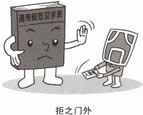 2. 画面的主体部分是《通用规范汉字表》伸出手对左边站立的“囧”表示拒绝,因为“囧”手持入场券要求进入。画面的下方书写着四个大字:拒之门外。