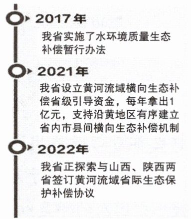 1. 河南乡村振兴开辟绿色路径。 2. 合适。理由:第一幅图摘编自 2022 年 7 月 12 日《河南日报》,报道了 2017 年、2021 年和 2022 年黄河水治理的举措,突出了“绿色河南,绿色中国”的主题。第二幅图摘编自 2022 年 7 月 10 日《人民日报》,报道了我国 2022 年上半年地级及以上城市空气质量状况明显提高的情况,这是我国各地都坚持绿色发展共同取得的成效,揭示了“绿色河南”与“绿色中国”的密切关系。 3.【示例】为了保护生态,我们要坚守“绿色生活”理念,为改变一部分人的陈旧观念做好宣传,为社会可持续发展贡献自己的一份力量。